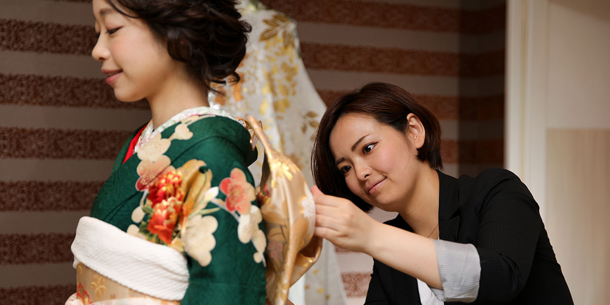 ブライダルヘアメイクは、リハーサルから当日のお支度、お開き後のアテンドまでの長きにわたり、おふたりのおそばにいるお仕事です。過度につくりすぎず、お客様のご希望に添ったヘアメイクのご提供ができるだけでなく、和装から洋装まで幅広く担当させていただいていますので、遠慮なくご要望をお聞かせください。